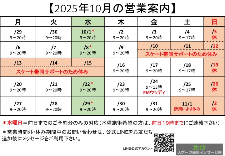 ☆水曜日=前日までのご予約分のみの対応となりますので、水曜日施術希望の方は前日までにご予約下さい。